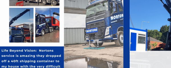 Life Beyond Vision: Nortons hiab service is amazing they dropped off a 40ft shipping container to my house with the very difficult task of manoeuvring through cars and small winding roads. Customer service has been amazing from beginning to the end always willing to go the extra mile driver helped position and the shipping container and did not leave until the whole process was complete. I highly recommend this service to anyone and would definitely used again when needed. Amazing 07/07/2020