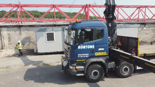 360 view of Nortons 855 Hiab at work delivering a portable cabin we are loaning to Accrington Stanley Football Stadium