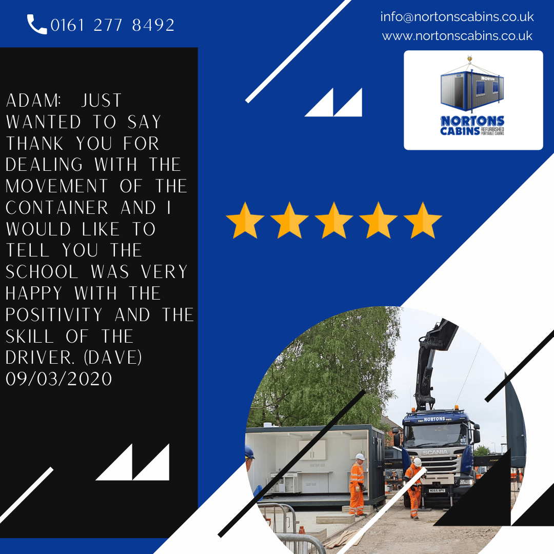 Adam: Just wanted to say thank you for dealing with the movement of the container and i would like to tell you the school was very happy with the positivity and the skill of the driver. (dave)