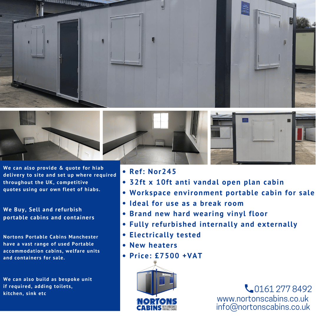 Nortons currently have a vast range of used refurbished Portable cabins and containers for sale including offices, toilet blocks & site welfare cabins.